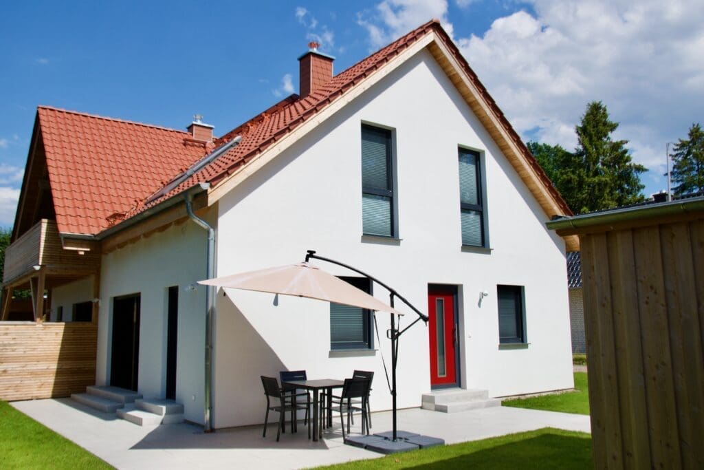 Die Wohnung befindet sich im Erdgeschoss eines Doppelhauses (linke Seite des Ferienhauses Zur Seetreppe 30 in Untergöhren).